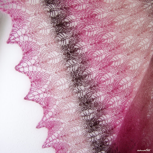 A lényeg: kendő, közepes méret, álompuha, gyönyörű színű. Most először dolgoztam olyan fonallal, ami szakasosan festett, így széles csíkokban van a váltás, mindez nagyon finoman megoldva, semmi éles árnyalatkülönbség. Csodás :)