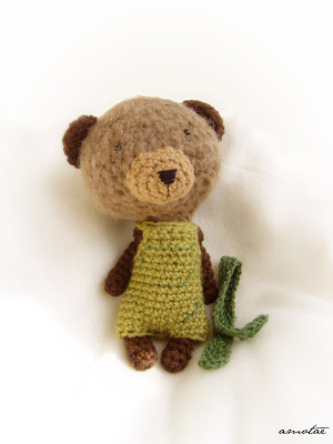 Medve Péter középszürke (nem, nem lila... a fotók csalhatnak), vastag mohairból készült pihe-puha szörmókos testét horgoltam, sőt, majdnem minden horgolt rajta -a világosmoha, asszimetrikus sálját kivéve, ami kötött. A füle-orra gyapjú. Zöld-barna kabátja szintén. Csupa természetes fonalat használtam hozzá. Hímzett orra szépen csillog, rendszeresen fényesíti.
